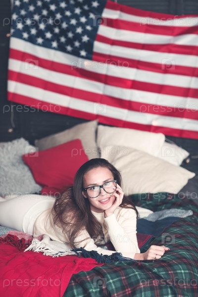 Красивая женщина в повседневной одежде на кровати с американским флагом на стене