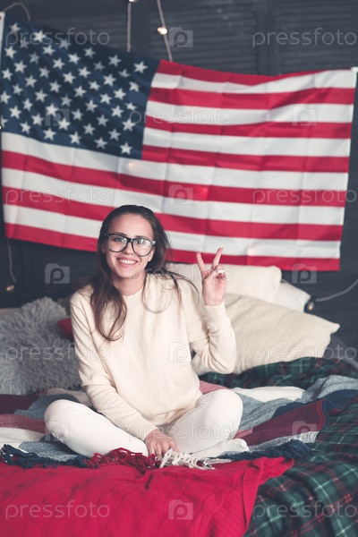 Красивая женщина в повседневной одежде на кровати с американским флагом на стене