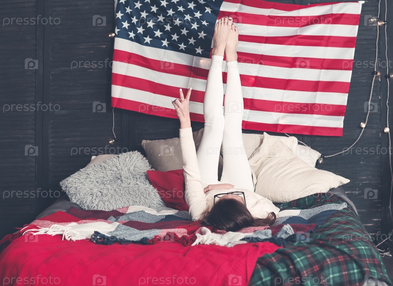 Красивая женщина в повседневной одежде на кровати с американским флагом на стене