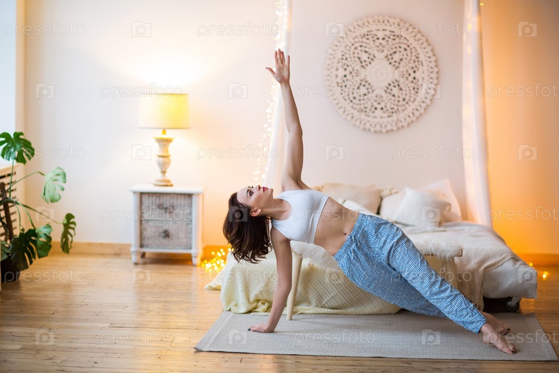 Улыбающаяся молодая шатенка в пижаме, практикующая йогу