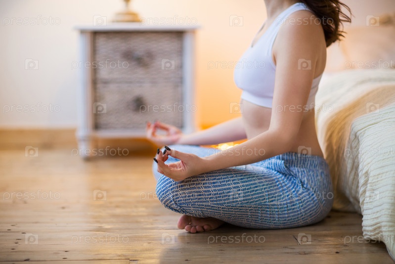 Улыбающаяся молодая шатенка в пижаме, практикующая йогу