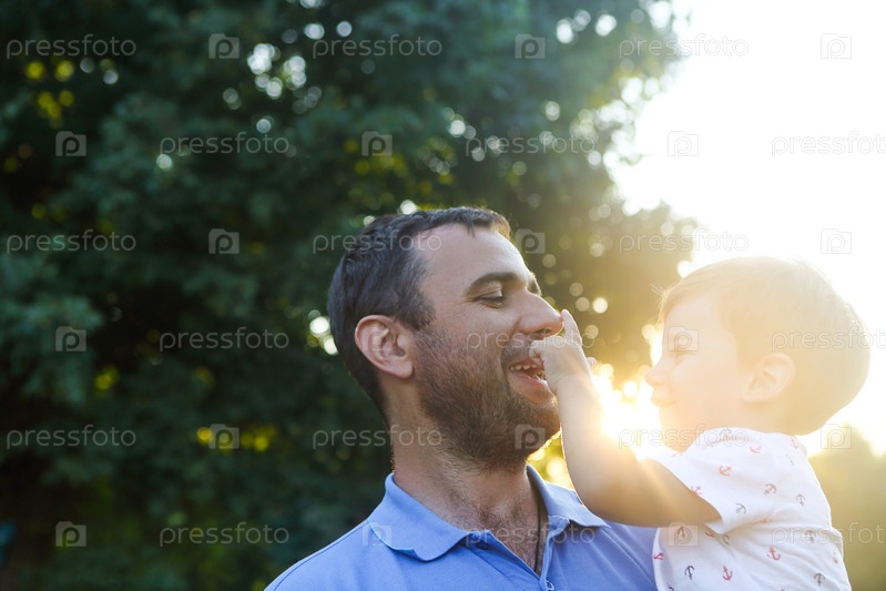 Портрет молодого человека, держащего в руках очаровательного спящего ребенка в саду