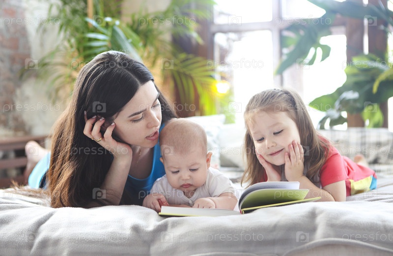 Мать читает книгу с дочерью и сыном в спальне