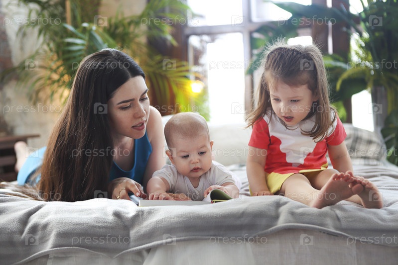 Мать читает книгу с дочерью и сыном в спальне