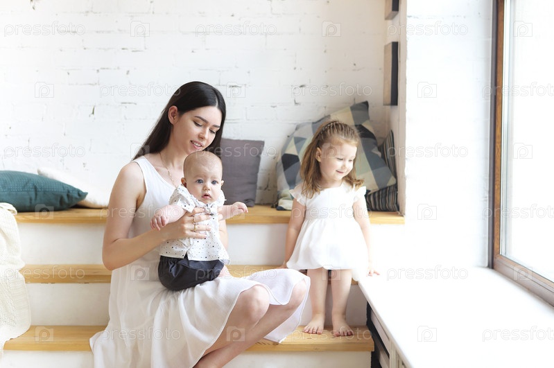 Счастливая мать и милые маленькие дети проводят время вместе и улыбаются в камеру
