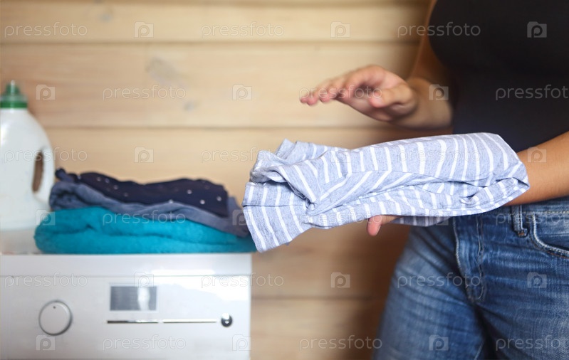 Молодая женщина берет белье из стиральной машины