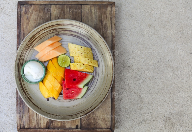 Блюдо с арбузом, манго, ананасом, лаймом, дыней и мороженым