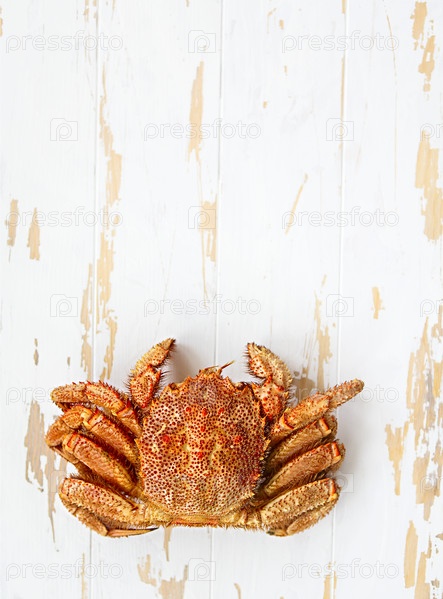 Один свежеприготовленный краб на деревенском белом деревянном столе