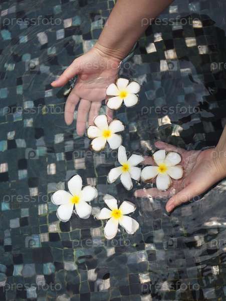 Цветы франжипани в руках в бассейне