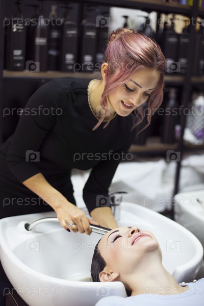 Великолепная жизнерадостная молодая женщина наслаждается массажем головы во время мытья волос профессиональным парикмахером