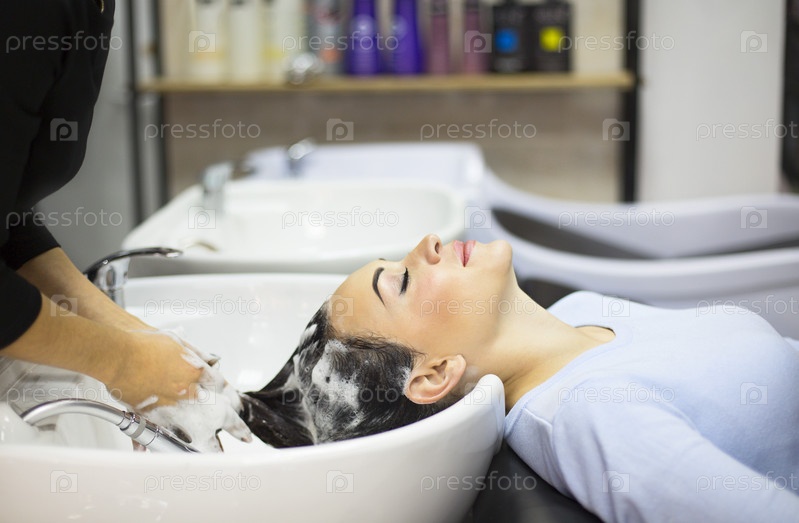 Великолепная жизнерадостная молодая женщина наслаждается массажем головы во время мытья волос профессиональным парикмахером