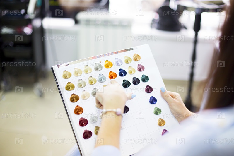 Крупный план клиентки, изучающей диаграмму цвета волос в парикмахерской студии, окрашивающей, окрашивающей, меняющей уход за волосами женщин