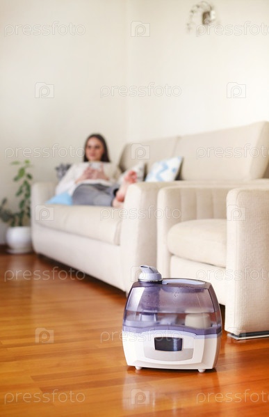 Симпатичная девушка на диване за увлажнителем