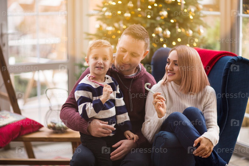 Радостные родители и сын с вкусными леденцами сидят в мягком кресле и празднуют Рождество в гостиной со светящейся елкой