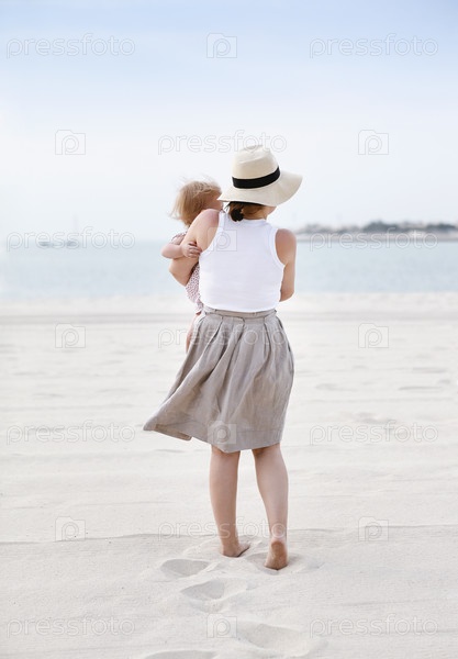 Женщина с ребенком стоит на песчаном пляже