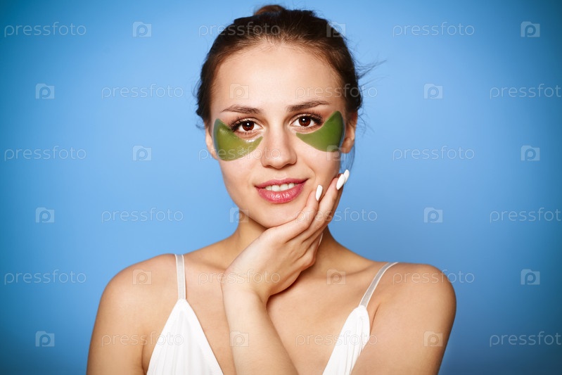 Красивая молодая девушка с зелеными пятнами под глазами на синем фоне