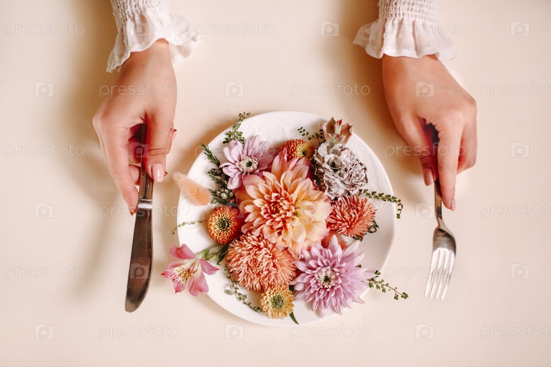 Женщина ест свежие цветы