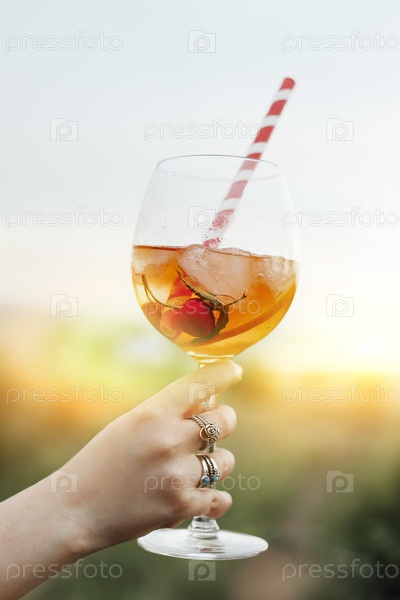 Молодая женщина держит бокал алкогольного коктейля с вишней и полосатой соломой