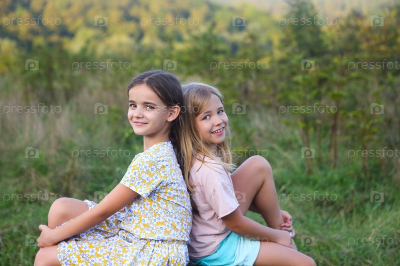 Портрет счастливых блондинок и темноволосых сестер, смеющихся и обнимающихся