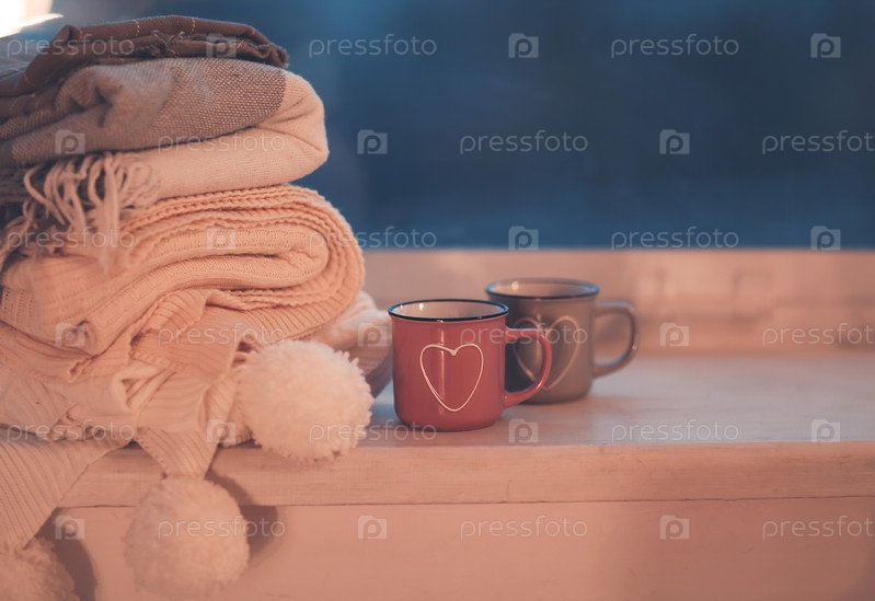 Кружки и уютные пледы на окне ночью