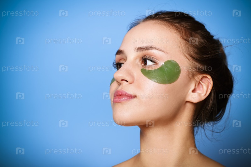 Красивая молодая девушка с зелеными пятнами под глазами на синем фоне