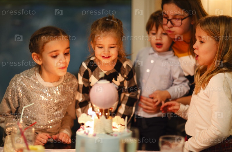 Группа радостных маленьких детей, празднующих день рождения и задувающих свечи на торте