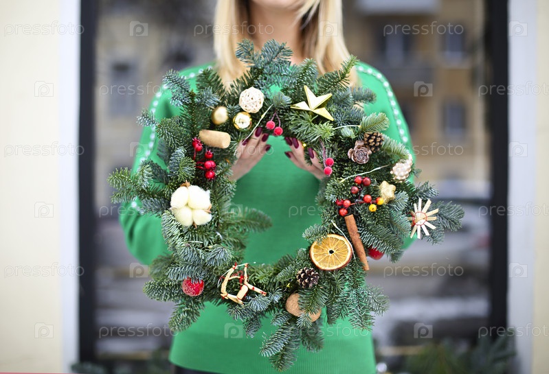 Женщина держит рождественский венок, сделанный ею самой