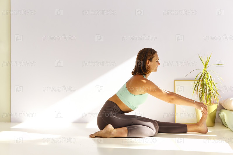 Гибкая женщина занимается йогой дома