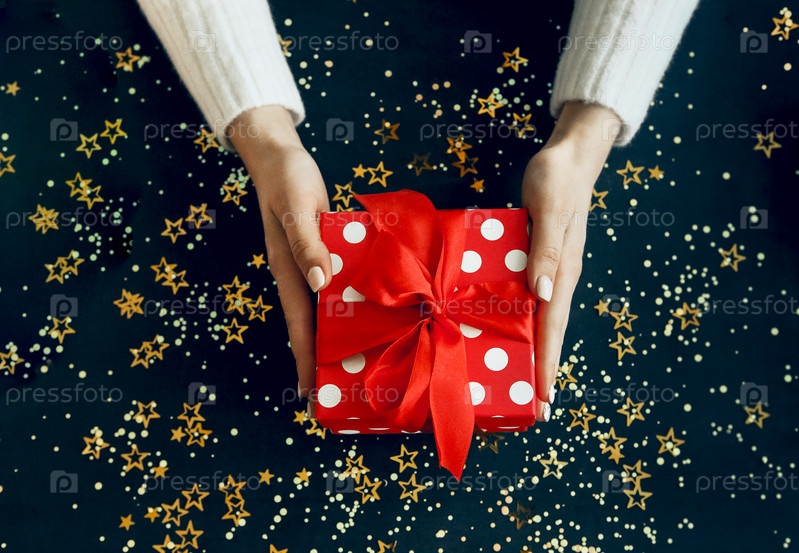 Женщина с завернутым подарком в студии