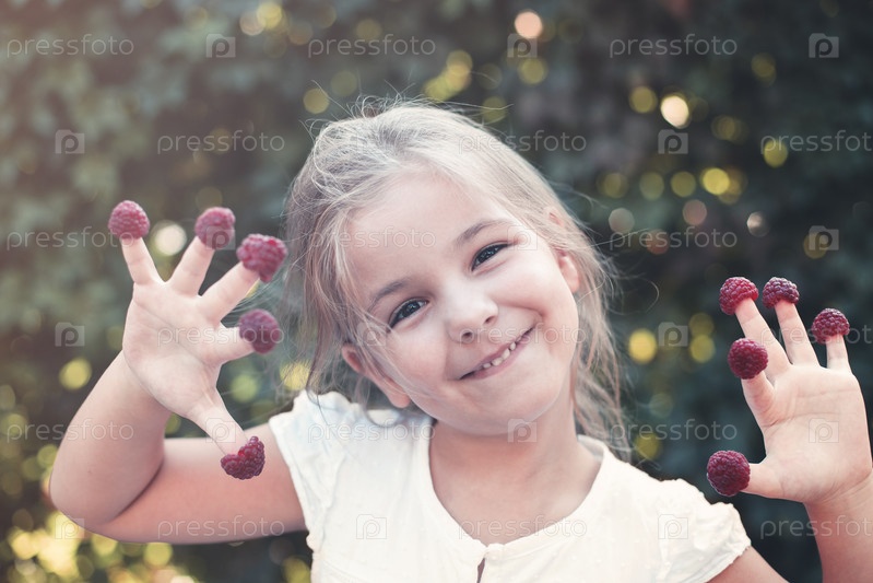 Улыбающийся маленький ребенок с малиной на открытом воздухе