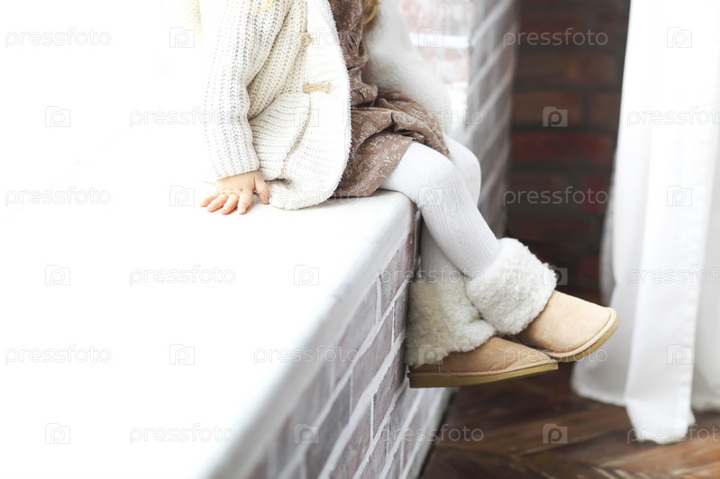 Маленькая девочка в теплой одежде и обуви сидит на подоконнике
