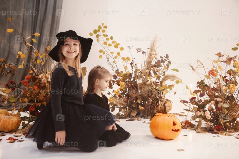 Маленькие смешные девчонки в костюме ведьмы на сцене