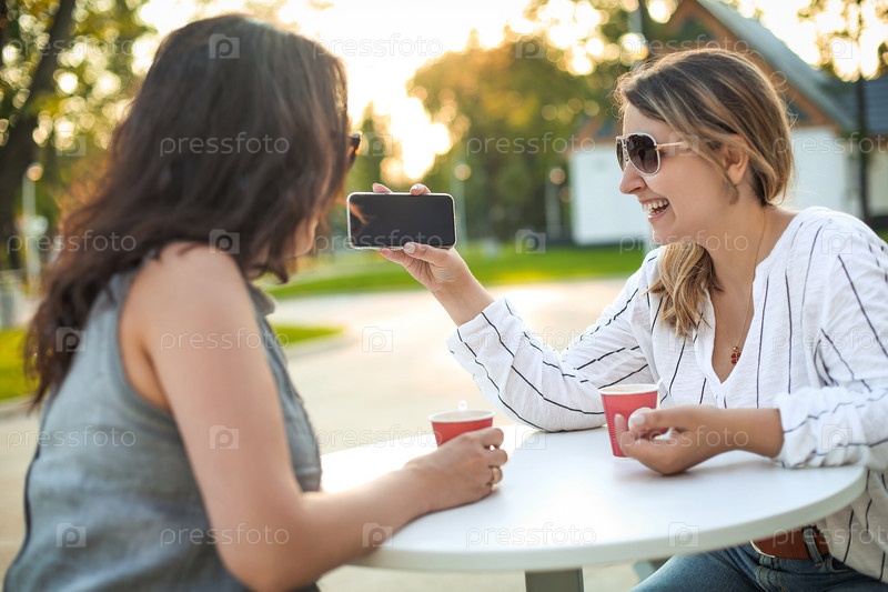 Веселые взрослые женщины с кофе и мобильным телефоном на улице