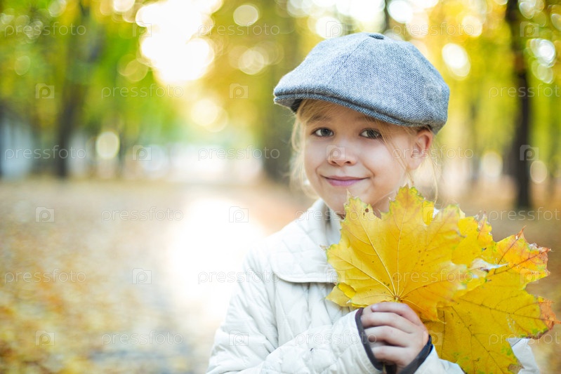 Ребенок держит желтые и красные листья. Маленькая девочка с кленовыми листьями