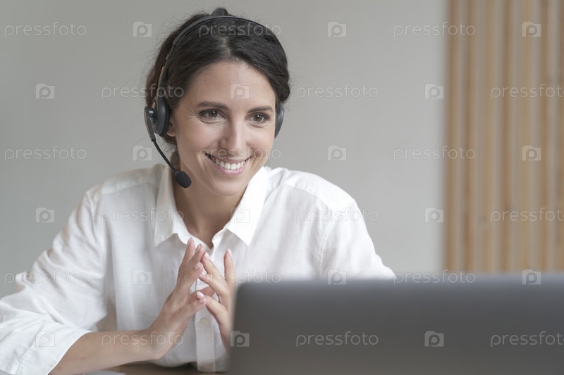 Улыбающаяся итальянская деловая женщина в беспроводных наушниках сидит за столом и работает на ноутбуке в домашнем офисе, приятная уверенная в себе сотрудница консультирует клиентов онлайн с использованием современных технологий