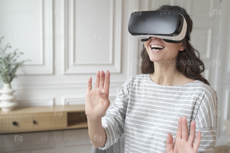 Молодая возбужденная женщина в гарнитуре VR взаимодействует с дополненным миром, играет в игры дома