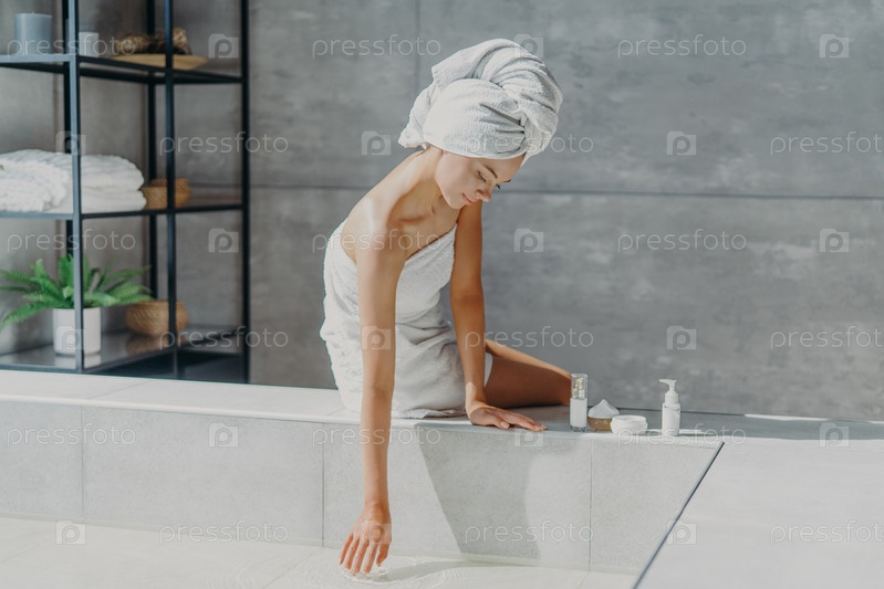 Спа, велнес и концепция ухода за кожей. Серьезная женщина, завернутая в банное полотенце, использует косметические средства для ухода за телом, собирается принять ванну, позирует в ванне. Расслабленная женщина дома. Спа-девушка