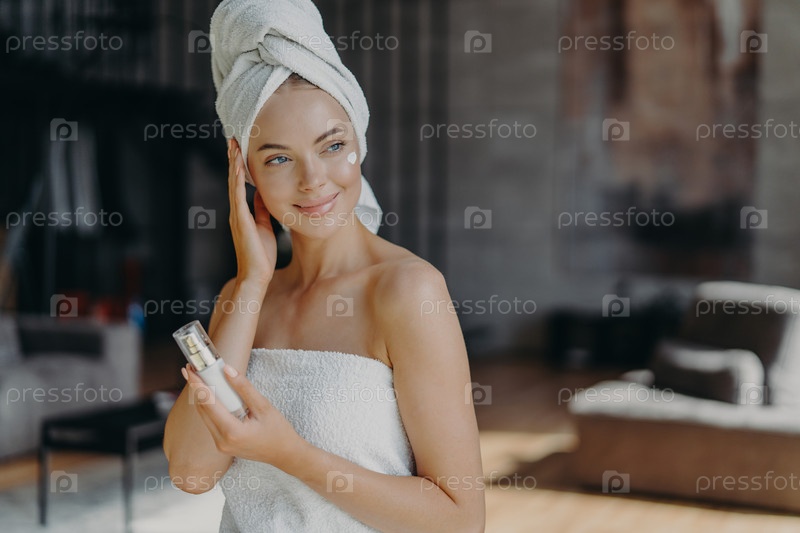 Довольная милая молодая европейка наносит лосьон для тела, завернутый в банное полотенце, смотрит в сторону с задумчивым выражением лица, стоит в помещении на размытом фоне в гостиной. Концепция ухода за кожей