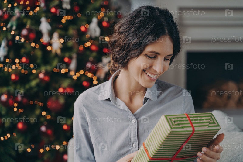 Счастливая довольная латиноамериканка с рождественской подарочной коробкой, сидя на диване возле елки