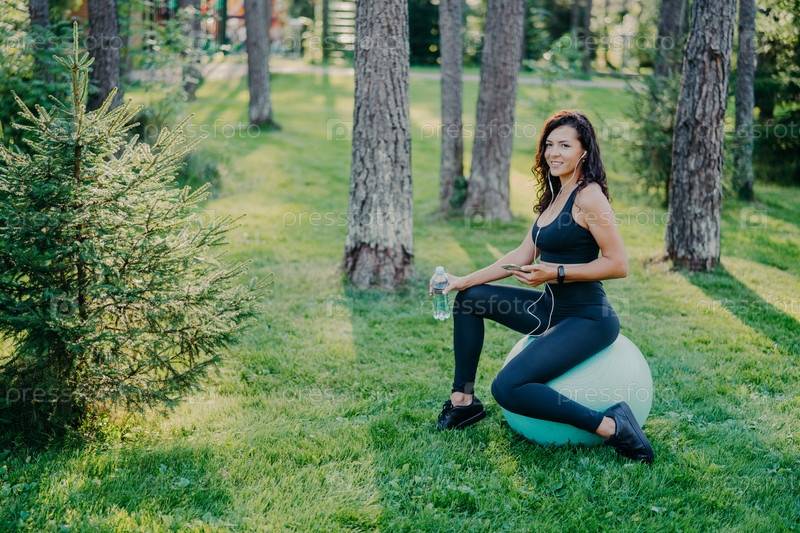 Горизонтальный снимок европейской брюнетки, одетой в укороченный топ и леггинсы, сидящей на фитнес-мяче, использующей смартфон и слушающей музыку в наушниках, держащей бутылку пресной воды, позирующей в лесу
