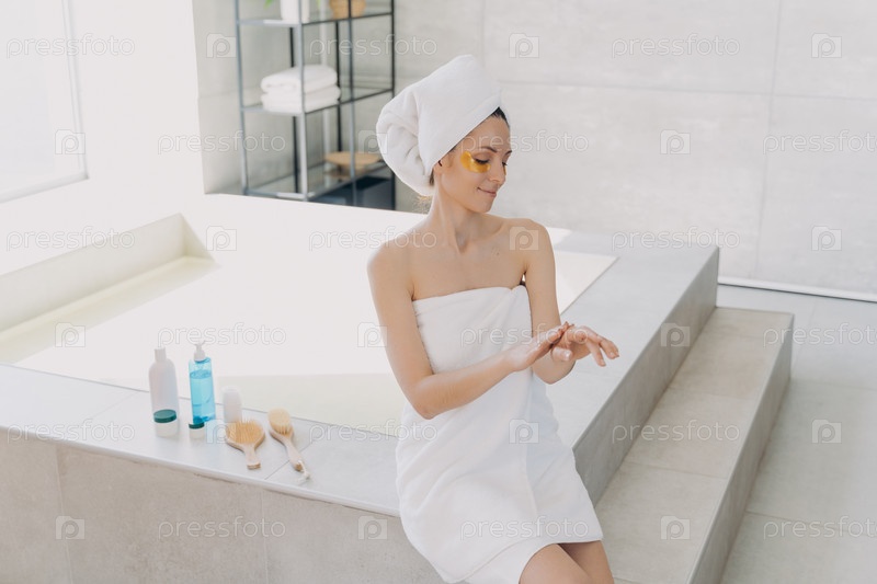 Девушка применяет повязки для глаз и крем для рук. Привлекательная кавказская женщина, завернутая в полотенце на спа-курорте