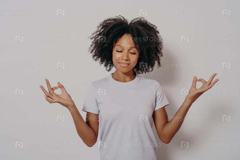 Студийный портрет спокойной и мирной молодой женщины смешанной расы, держащей руки в жесте мудры и закрытыми глазами, медитирующей, стоя изолированной над белой стеной. Концепция медитации