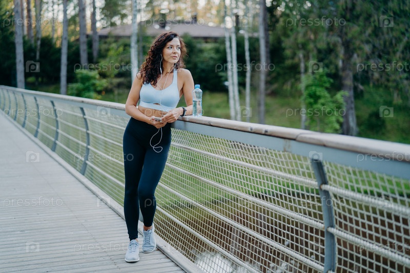Серьезная задумчивая женщина с пятнистым телом, одетая в укороченный топ и леггинсы, позирует на мосту, задумчиво смотрит в сторону, слушает музыку в наушниках. Люди, здоровый образ жизни и фитнес-концепция