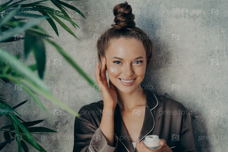 Красивая молодая женщина наносит увлажняющий крем на лицо