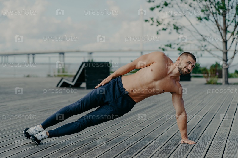 Спортивный бодибилдер стоит на боковой доске, тренируется на свежем воздухе и носит спортивную одежду, ведет здоровый образ жизни, имеет подтянутое тело и мышцы. Открытый снимок решительного спортсмена занимается оздоровительной деятельностью