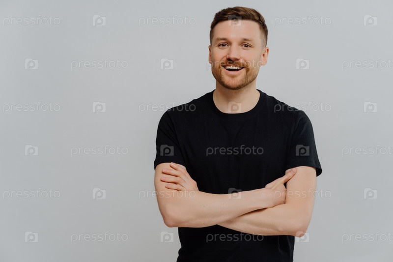 Позитивный молодой человек позирует в студии со счастливым выражением лица