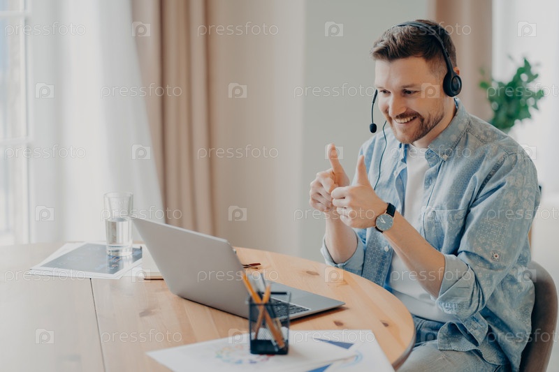 Счастливый бородатый мужчина во время онлайн-звонка с другом дома