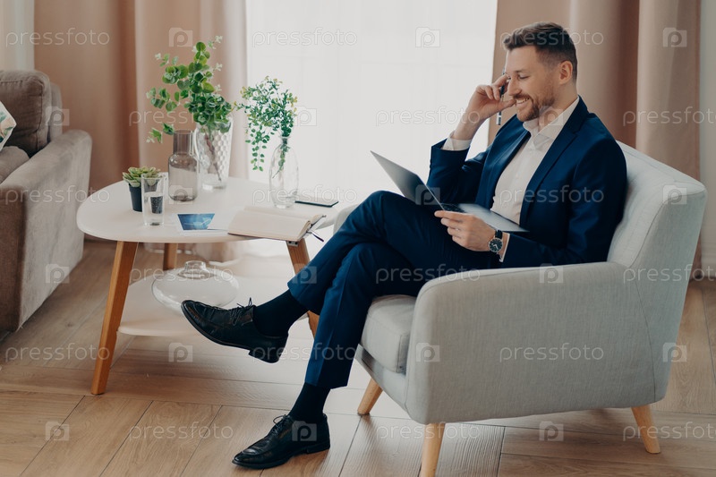 Внутренний снимок корпоративного работника мужского пола, одетого в формальную одежду, радостно смотрит на ноутбук, держит ручку, общается в онлайн-позах в кресле на фоне уютного домашнего интерьера. Занятый генеральный директор