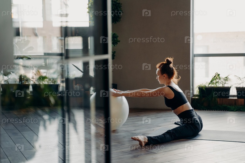 Молодая рыжая стройная женщина сидит в шпагате с фитболом, делает упражнения на растяжку