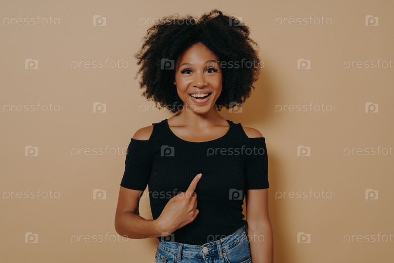 Янг значит меня? Портрет счастливой молодой женщины смешанной расы, указывающей пальцем на себя и смотрящей в камеру с удивленным выражением лица, одетой в черную футболку. Язык тела и человеческие эмоции
